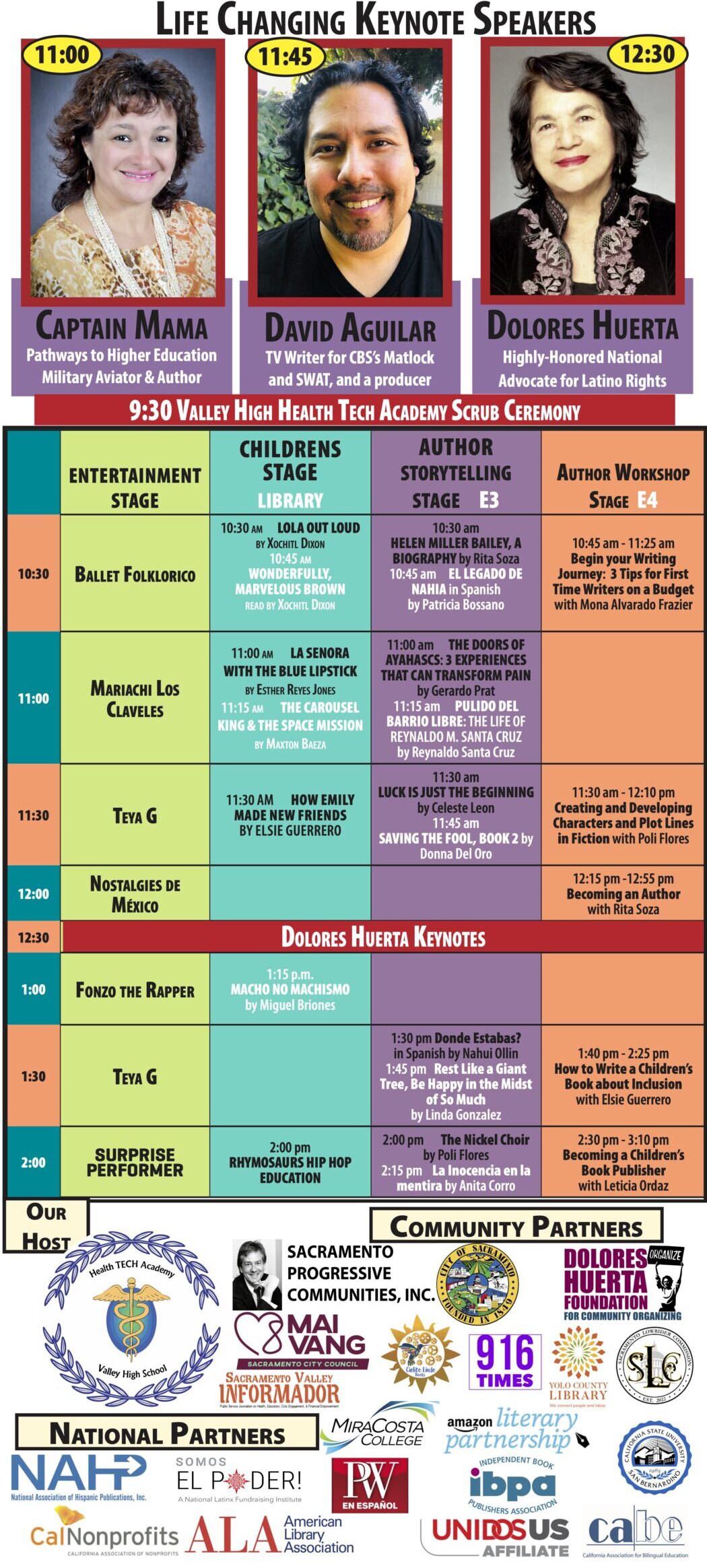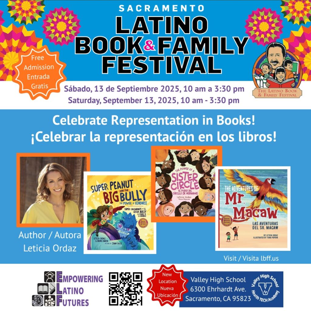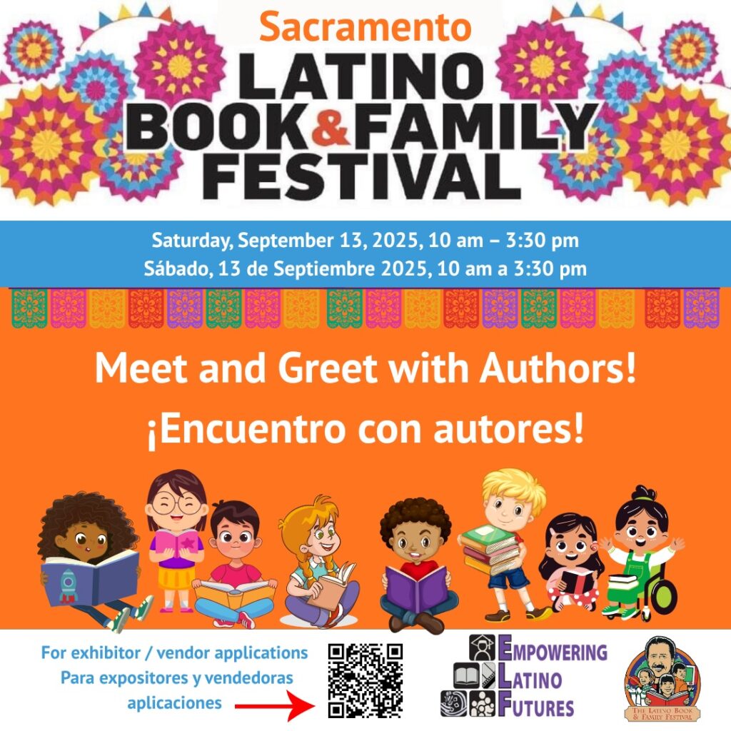 ........ Saturday, September 13, 2025 sabado, 13 de septiembre10:00-3:30Valley High School, Sacramento CA Sign up to be an Exhibitor/Author/Partner When? Saturday September 13, 202510:00 am-3:30 pm Sábado, 10 de septiembre 2025, 10 am–3:30 pm Where? Valley High School 6300 Ehrhardt Ave. Sacramento, Ca 95823 Free admission and parking Entrada y estacionamiento gratis Over 100 Exhibitors Más de 100 expositores Get autographed books Firma de libros por los autores Bilingual activities & Workshops Actividades y talleres bilingües Health, education, financial empowerment Salud, educación, empoderamiento financiero Sign up to be an Exhibitor/Author/Partner Keynote Speakers "Captain Mama" Grace Tiscareño-Sato Award Winning Author, Military Aviator, Pathways to Higher Education11:00 a.m. This is the headingDavid Aguilar TV Writer for CBS' Matlock, and SWAT, and Producer11:45 a.m. Highly Honored National Advocate for Latino Rights, Renowned Activist and Labor Rights Leader12:30 p.m. Authors /Autores Únanse a nosotros en este festival; participen como partner, exhibitor o author Quiero participar como: Exhibitor Partner Author Activities /Actividades Exhibitors / Expositores Community Resources Health Education Finance Community Libraries Plus, food vendors Raffles & Prizes Book Reading Workshops / Talleres Author Workshops Entertainment / Entretenimiento Where? About our host Valley High School Sacramento, Ca
